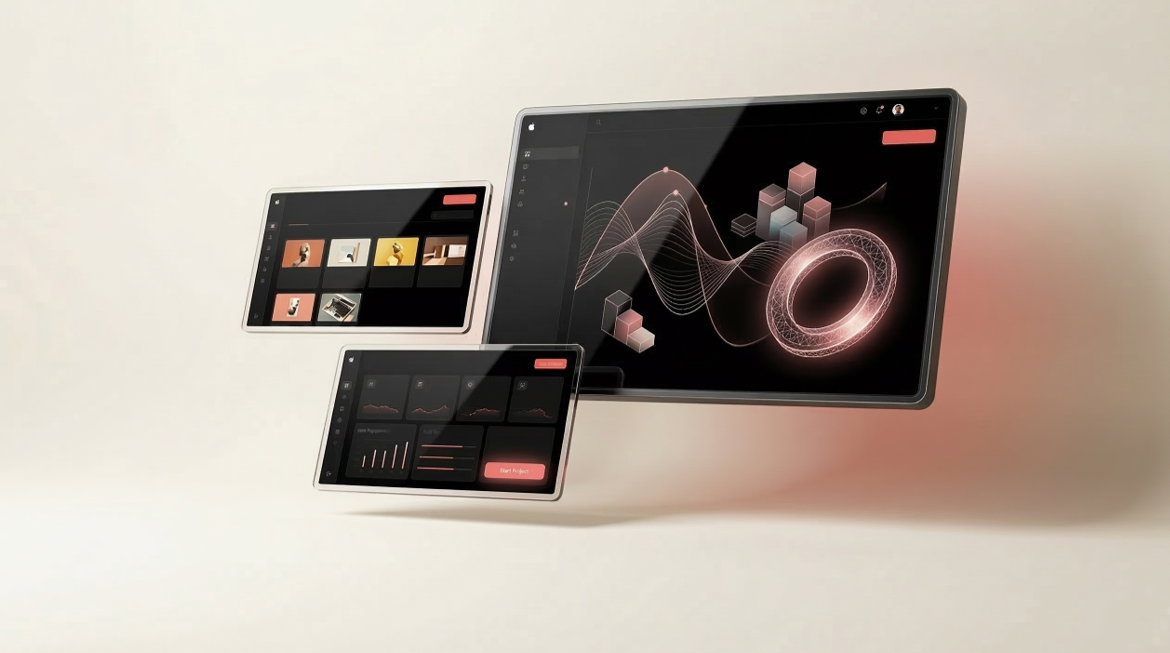Grandes surfaces sombres, objets data, compositions tablette et lumière douce : un langage idéal