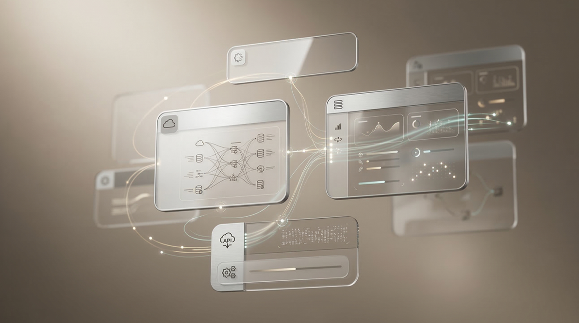 Panneaux translucides, logique API, liens lumineux et supervision claire : cette direction traduit